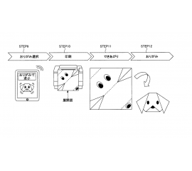 撮影したキャラクター(塗り絵)のデータをもとに、折り紙(展開図)を印刷する技術です。 塗り絵したものを折り紙にして遊ぶことが可能です。