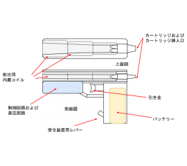 本コイルガン式携帯型捕獲装置(以下、本装置)は、専用のカートリッジ内に格納されたワイヤーの付いた重りを磁力の力で射出し標的に絡ませて捕獲する捕獲装置です。 直接標的に触れることなく安全に捕獲が可能となります。