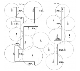 作業員が携帯するRFIDタグと各所に設置された受信器との通信によって、工程、ライン、滞在時間を識別して、作業員の実績を精度良く管理する技術です。