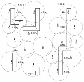 作業員が携帯するRFIDタグと各所に設置された受信器との通信によって、工程、ライン、滞在時間を識別して、作業員の実績を精度良く管理する技術です。