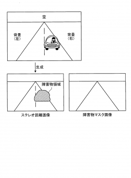 Visual SLAM技術等における、自動車の走行時に自己位置を特定するための地図の生成に関する技術です。地図を生成するために撮像した画像内に人や車などの移動物体が含まれていたとしても、これらの移動物体を含まない建物や道路、標識などの静止物体のみを含んだ地図を作成します。