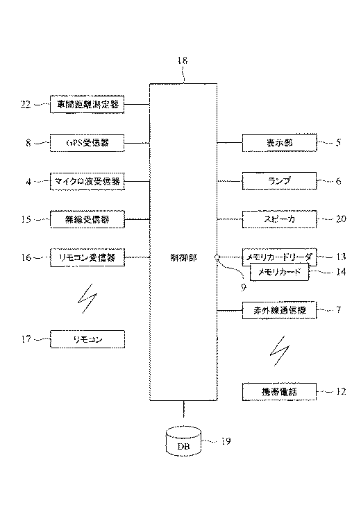 自車両の前方物との距離を検出する車間距離測定器22と、自車両の速度を検出する速度検出手段と、マイクロ波を検出するマイクロ波受信器4を備え、警報手段は、マイクロ波受信器によって所定のマイクロ波が検出された場合にマイクロ波検出警報を報知するマイクロ波警報報知機能と、車間距離測定器で検出された自車両の前方物との距離と速度検出手段によって検出した自車両の速度とに基づき車間警報を報知する車間警報報知機能とを有する。そしてマイクロ波警報報知機能による報知と車間警報報知機能による報知を異なる態様で行う。