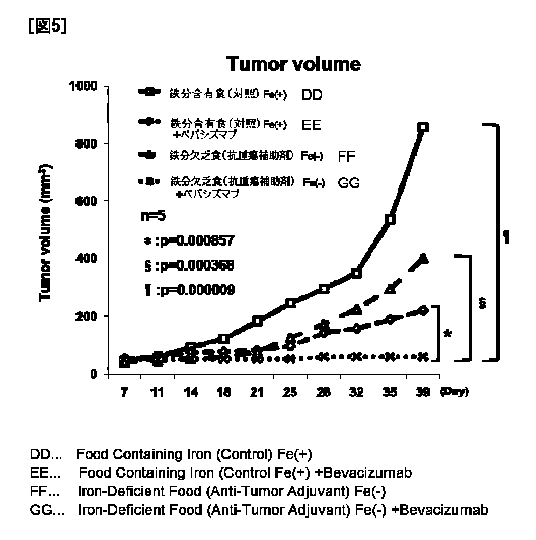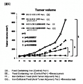 癌治療剤と共に使用する抗腫瘍作用補助剤であって、生体内の鉄分を低減化しうる物質からなることを特徴とする抗腫瘍作用補助剤。臨床栄養剤及び/又は栄養調整食品から鉄分を除去してなる抗腫瘍作用補助剤による。抗癌剤などの癌治療剤とは別に、鉄のキレート化剤や、鉄分を含まない臨床栄養剤及び/又は栄養調整食品の提供により血清鉄を低減させる事で、腫瘍の増殖自体を抑制し、同時に血管新生が亢進しうる。