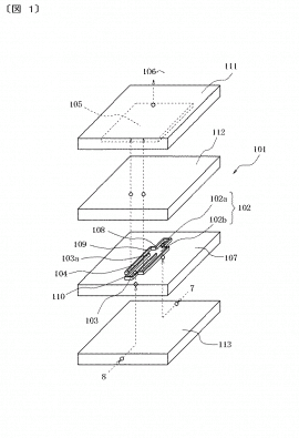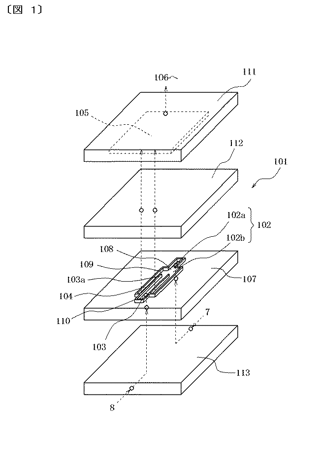 図1はマイクロミキサーの要部構成を示した分解斜視図である。第1流体が第1方向に指向した流れになるように案内する細溝部102aと太溝部102bとを連結して構成される第1区画溝102と、第1区画溝の太溝部内に、第1方向とは逆向きに指向した流れになるよう第2流体を案内する先端溝部103aを有し、第1区画溝内を流れる第1流体7と第2区画溝103内を流れる第2流体8とを向流で衝突させて得られる混合流体9を、第1方向と同じ向きに指向した流れに案内するとともに、混合流体の圧力を高める第3区画溝104と、第3区画溝と連通し、第3区画溝から吐出される混合流体9の流体圧力を下げ、これに伴って生じる渦流により混合流体の混合を促進させる混合促進空間105と、混合促進空間内の混合流体を所定の回収手段へ案内する案内部材106とを有する。図2は図1のマイクロミキサーにおいて、第1区画溝内を通る第1流体と第2区画溝内を通る第2流体とが対流で衝突させて混合流体となることを説明するための概念図である。