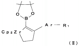 この技術では、式(I)(式中、Arは同一又は異なるアリール基、R1、R2及びR3はそれぞれ独立に水素原子、置換基を有してもよいアルキル基、置換基を有してもよいアルコキシ基、置換基を有してもよいアルキルカルボニル基、置換基を有してもよいアルキル又はアリールカルボキシ基、置換基を有してもよいアルキル又はアリールスルホニルオキシ基、カルボン酸エステル基、アシルアミノ基等を意味する。)で示されるトリアリールエチルエテン誘導体の製造方法は、アリール基にR1を有するアリールエチニルボロン酸ピナコールエステルとジルコノセン-エチレン錯体とを反応させて、式(II)で示される化合物を生成する工程を有する。(式中、Cpはシクロペンタジエニル基を意味する。)また、化合物(II)のZr原子を含む5員環を開環後、芳香族環に置換基としてR2を有していてもよい第1ハロゲン化芳香族化合物と、芳香族環に置換基としてR3を有していてもよい第2ハロゲン化芳香族化合物と、を反応させる工程を有する。