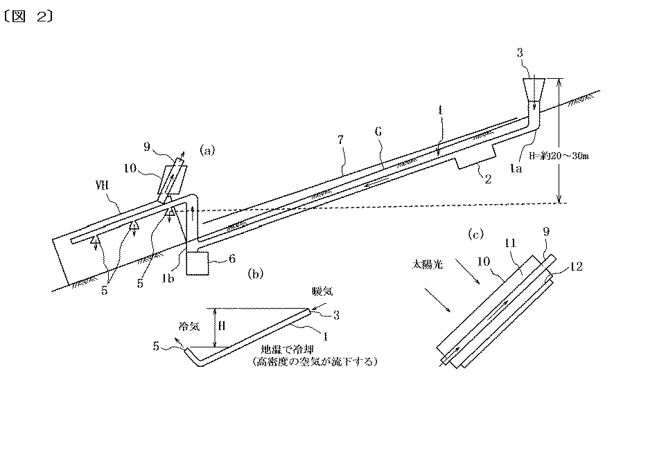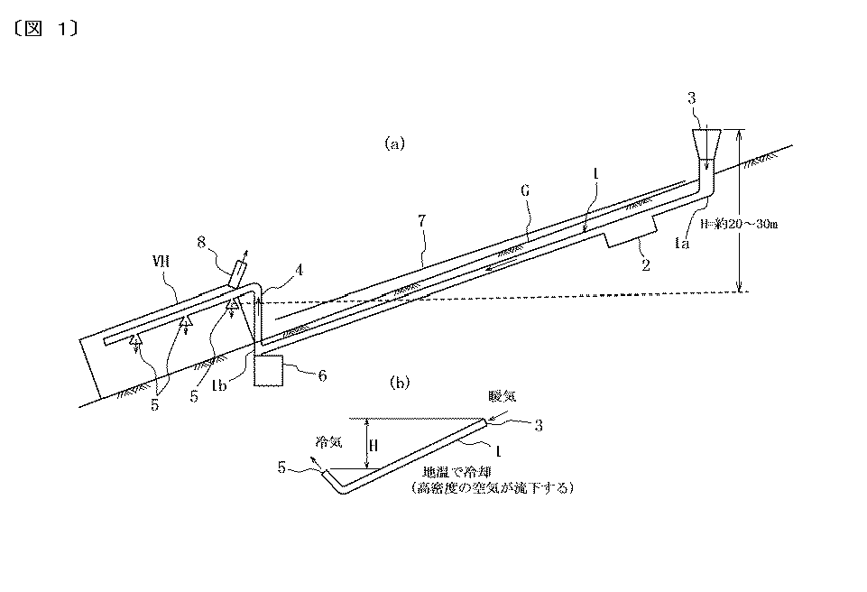 図1(a)は、傾斜地利用型環境調節システムを示す構成図、図1(b)は、傾斜地利用型環境調節システムの作動原理を示す説明図である。傾斜地利用型環境調節システムは、傾斜地Gにその斜面に沿って埋設されて地温により冷却される一または複数本の地中流路1と、地中流路の上端部に接続された外気取り入れ口3と、構造物VHの内部空間に設けられて地中流路の下端部に接続された空気吐出口5と、を具え、地中流路1内の空気がその地中流路で冷却されてその地中流路内を下降流動して空気吐出口5から構造物VHの内部空間に吐出され、その地中流路1内の空気の下降流動に伴って外気取り入れ口3から外気がその地中流路内に取り入れられる。図2(a)は、傾斜地利用型環境調節システムの他の例を示す構成図、図2(b)は、傾斜地利用型環境調節システムの作動原理を示す説明図、図2(c)は、傾斜地利用型環境調節システムの気流加速パイプ周辺を拡大して示す断面図である。