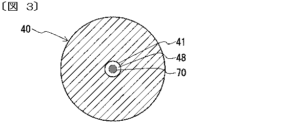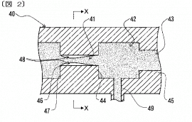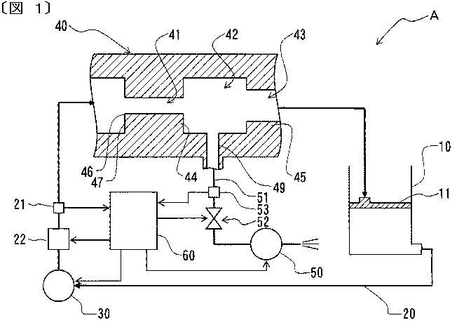図1は脱気・溶解装置(脱気装置)の概略模式図、図2は空洞形成管に空洞が形成された状態の説明図、図3は図2のX-X断面図、である。脱気装置Aは、処理される液体を貯留するタンク10と、このタンク10に両端をそれぞれ接続して周回状の流路を構成する配管20と、この配管20の中途部に設けてタンク10の液体を吸引して下流側に送給するポンプ30と、配管20の中途部に設けて液体が接する空洞を形成する空洞形成部である空洞形成管40と、この空洞形成管40内に形成した空洞内を減圧する減圧手段である真空ポンプ50とで構成する。空洞形成管40には、図1に示すように、内側に向けて膨出した円筒絞り状の第1遮蔽体44を設けて配管20の流通面積よりも小さい流通面積とした第1流路41と、この第1流路41の流通面積よりも大きい流通面積とした第2流路42と、この第2流路42の流通面積よりは小さく、第1流路41の流通面積よりは大きい流通面積とした第3流路43をこの順で上流側から設ける。第1遮蔽体44には、第1流路41の上流側の端縁にキャビテーションを生じさせるための剥離点46を設ける。