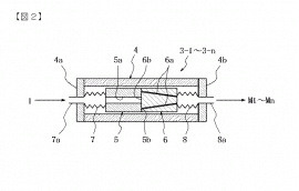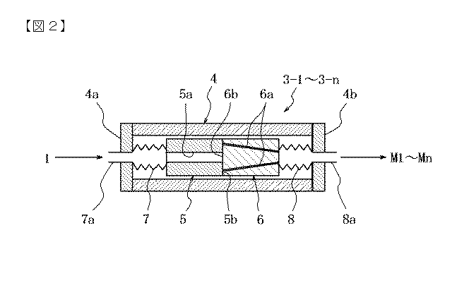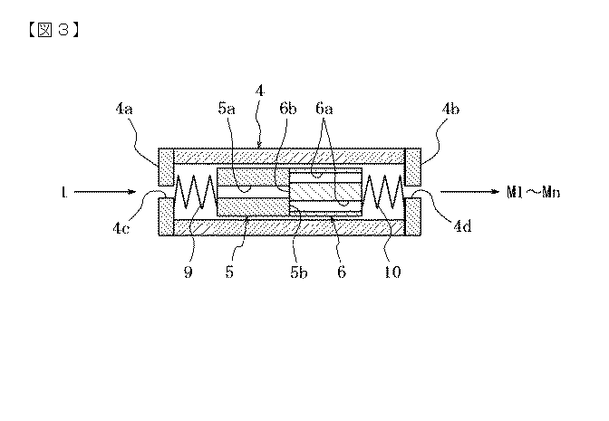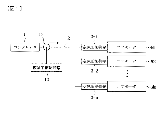 図1に示す、コンプレッサ1からの加圧空気の供給路2に接続された空気圧制御弁3-1~3-nと、それらの空気圧制御弁を作動させるために、コンプレッサ1からの加圧流体に所定周波数の振動を加える振動子12および振動子駆動回路13とを具え、空気圧制御弁3-1~3-nが各々加圧空気から所定周波数の振動を伝えられるとその振動に共振して加圧空気の流路を開放するように振動する弁体を有する、共振制御式空気圧制御システムである。空気圧制御弁3-1~3-nは図2に示すように、円筒状のスリーブ4と、そのスリーブ4内に左右方向に摺動自在に配置され内部に加圧空気通路5aを有する、弁体としての第1の振動体5と、その第1の振動体5の端面5bと密接可能な端面を6b有し内部に加圧空気通路6aを有する第2の振動体6と、スリーブ4の左方の端壁4aによって支持されて第1の振動体5をその第2の振動体6へ向けて常時附勢する、スプリングとして蛇腹状の筒である第1のベローズ7とを具えている。第2の振動体6も同様に配置され、端壁4bにより支持されてスプリングとして蛇腹状の筒である第2のベローズ8を具える。図3は空気圧制御弁を示す断面図である。