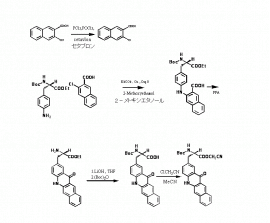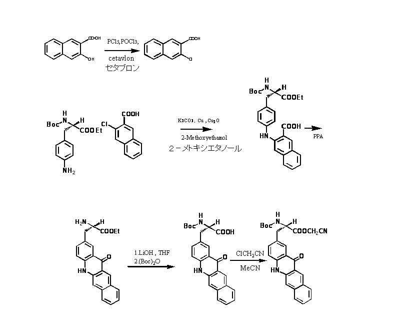 ハロナフタレン誘導体(例えば、3-クロロ-ナフタレン-2-カルボン酸)及び3-(4-アミノ-フェニル)-2-tert-ブトキシカルボニルアミノ-プロピオン酸エステル(例えば、エチルエステル)とのカップリングにおいて、Cu↓2O及びエチレングリコールモノアルキルエーテル(例えば、メトキシエタノール)を用いて、従来のジメチルホルムアミド(DMF)及びCuを用いたカップリング法に比べ、収量を大幅に改善して蛍光物質を合成する。この蛍光物質は、水・エタノール(体積比1:1)の混合溶液中での極大吸収波長を420~520nmとし、蛍光寿命は10~20ナノ秒程度で、夾雑物質の蛍光が消光した後に標識した測定対象物の蛍光を検出することが出来、1分子のペプチドやタンパク質に組み込んで、蛍光性ペプチドやタンパク質を調製する蛍光性試薬を得ることが出来る。