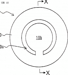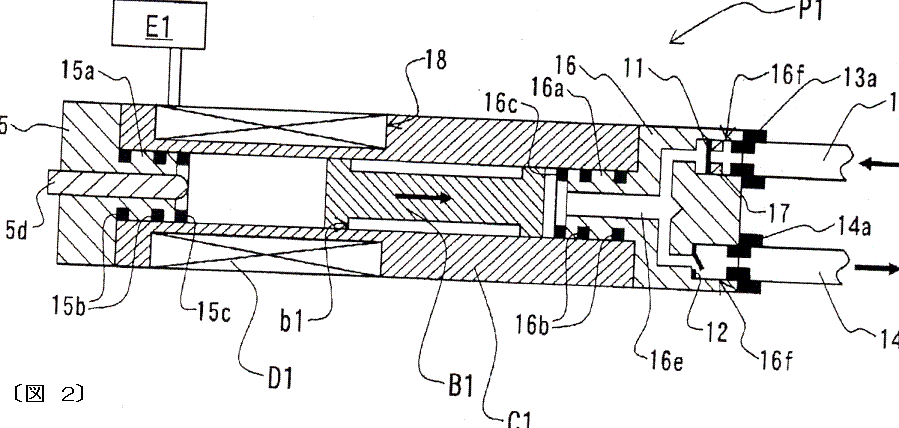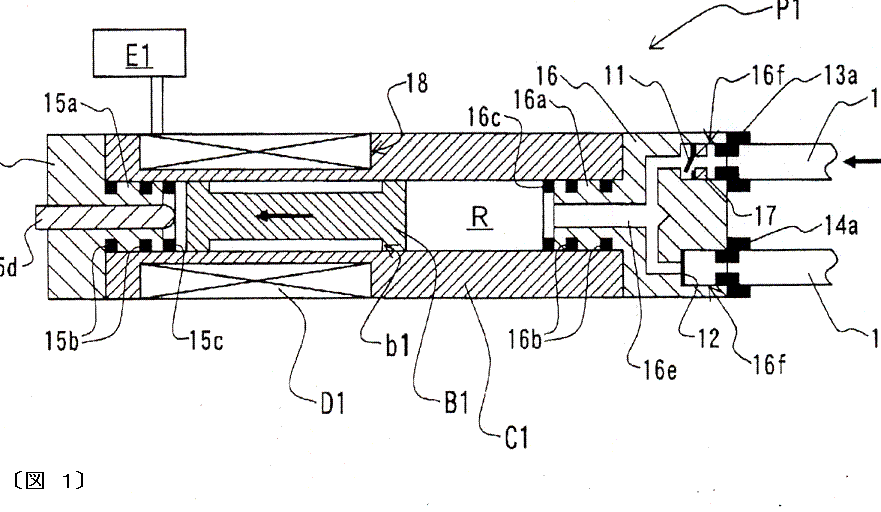 図1及び図2は、ポンプP1の断面概略複式図である。このポンプP1は、両端に磁極を有する棒状磁石からなるピストンB1と、このピストンB1が内設されるシリンダC1と、このシリンダC1に擬装したコイルD1と、このコイルD1に交流電流を通電する通電制御部を備えた電源E1とで構成しており、このポンプP1では、シリンダC1の一端に吸入側一方向弁11を介して送給配管13を連通達結するとともに、送出側一方向弁12を介して送出配管14を連通連結している。ピストンB1は円柱惨状の磁石で構成し、断面円形としたシリンダC1の内周面に沿って進退可能としている。棒状磁石でピストンB1を構成することにより、ピストンB1の一方の端部はN極、他方の端部はS極の磁極を有している。吸入側一方向弁11は、図3に示すように吸入側一方向弁装着部16fに内装可能とした円板体10で構成しており、この円板体10に円弧状のスリット10aを設けてこのスリット10aの内側部分を弁知10bとしている。