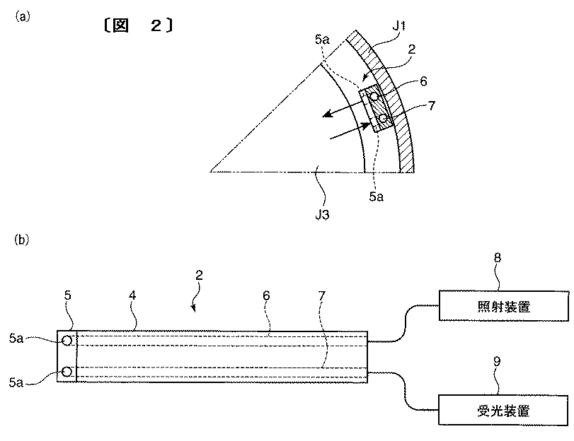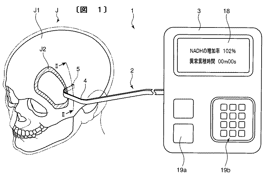 脳の外表面に向けて配置可能な先端部をそれぞれ有する一対の光ファイバと、一方の光ファイバの基端部に接続され、この光ファイバを介して脳の外表面に対して紫外線を照射可能な照射部と、他方の光ファイバの基端部に接続され、この光ファイバを介して、上記紫外線により脳細胞が励起されて発光した蛍光を受光可能な受光部と、照射部による紫外線の照射・照射停止を制御するとともに、受光部により受光した蛍光の強度を算出可能な制御部と、この制御部により算出された蛍光強度を表示可能な表示部とを備え、記照射部は、光源と、この光源と光ファイバとの間に配置され、光源の光路を開放・遮断可能なシャッタとを備え、制御部は、シャッタの開放・遮断タイミングを制御するとともに、シャッタを開放する場合には少なくとも2秒以上開放し、この開放時間の間に累積された蛍光強度を算出する脳の虚血監視モニタである。図1は、脳の虚血監視モニタ1を、脳動脈瘤のクリッピング手術時に使用した状態で示す全体概略図であり、図2の(a)は、図1のII-II線断面図、(b)は、図1のケーブル帯2を拡大して示す平面図である。